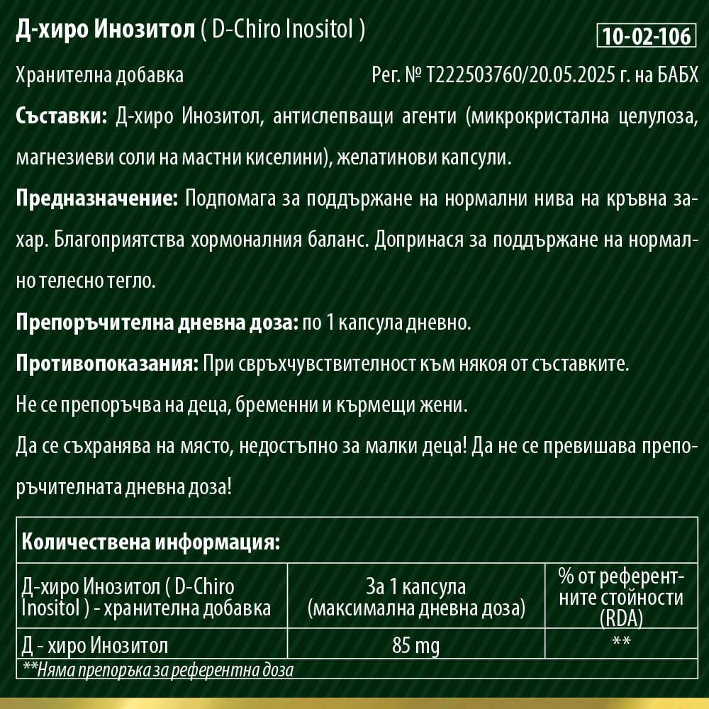 Всяка капсула (максимална дневна доза) Д-хиро Инозитол (D-chiro inositol) на Витаголд съдържа: 85 мг Д-хиро инозитол. (Не съдържа глутен, ГМО, захар или изкуствени оцветители)